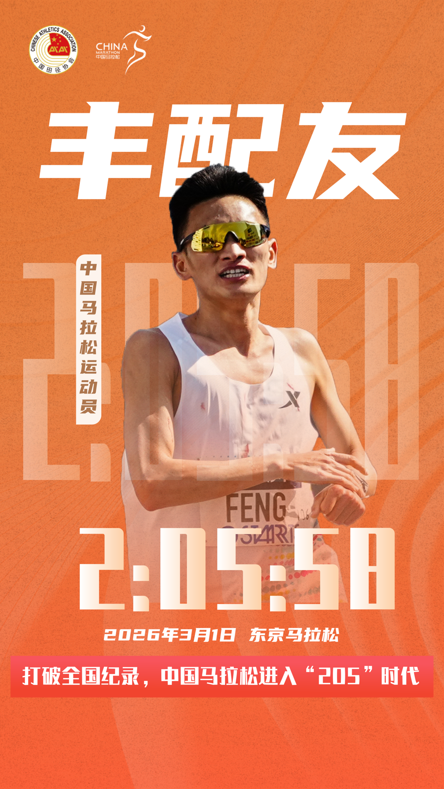 中国男子马拉松正式跨入“205”时代。在3月1日举行的2026年东京马拉松中,中国选手丰配友跑出2小时05分58秒,将何杰保持的全国纪录(2小时06分57秒)大幅提升59秒,成为首位跑进2小时6分钟的中国马拉松运动员,翻开中国马拉松的崭新篇章。